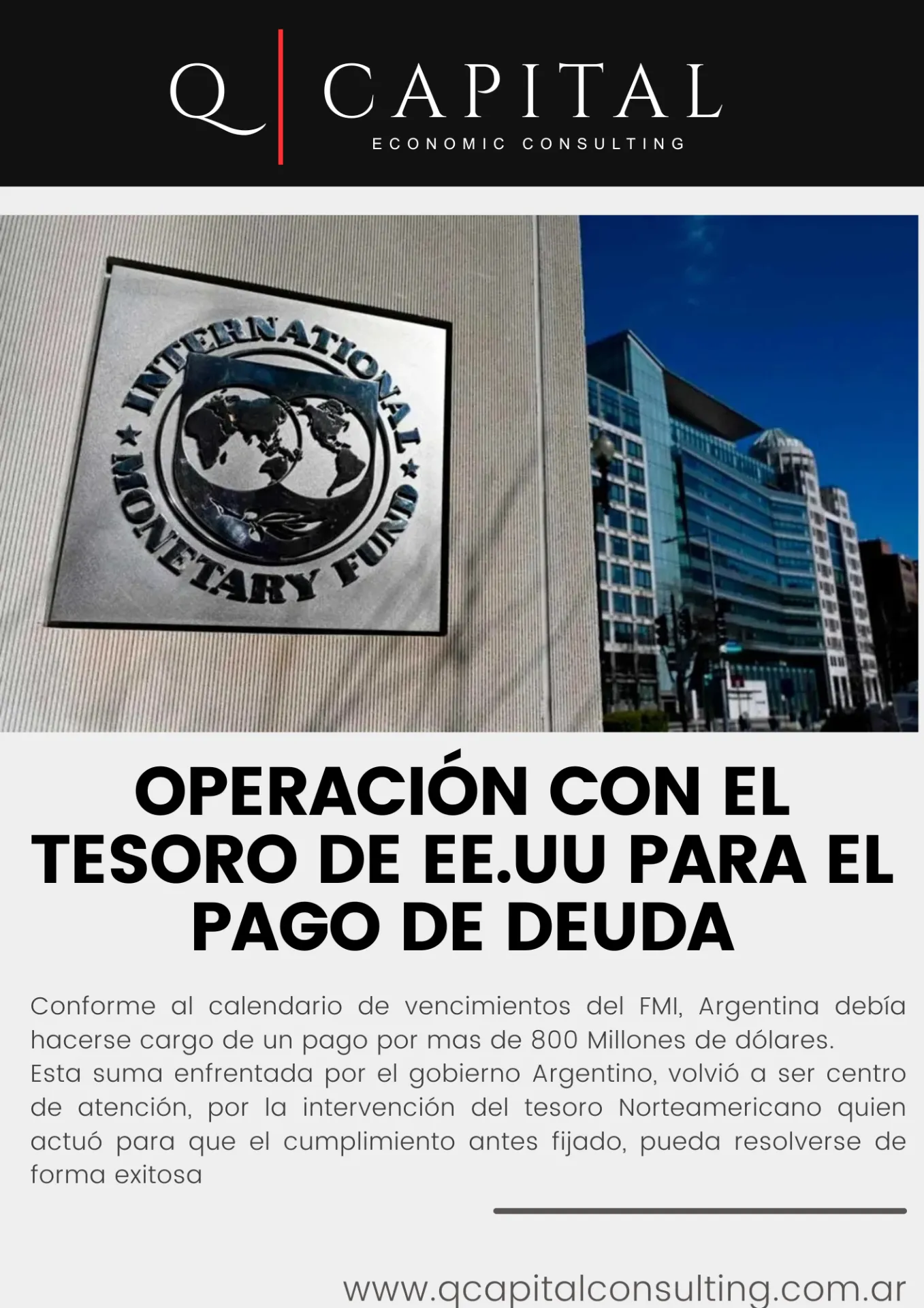 Conforme al calendario de vencimientos del FMI, Argentina debía hacerse cargo de un pago por mas de 800 Millones de dólares. Esta suma enfrentada por el gobierno Argentino, volvió a ser centro de atención, por la intervención del tesoro Norteamericano quien actuó para que el cumplimiento antes fijado, pueda resolverse de forma exitosa