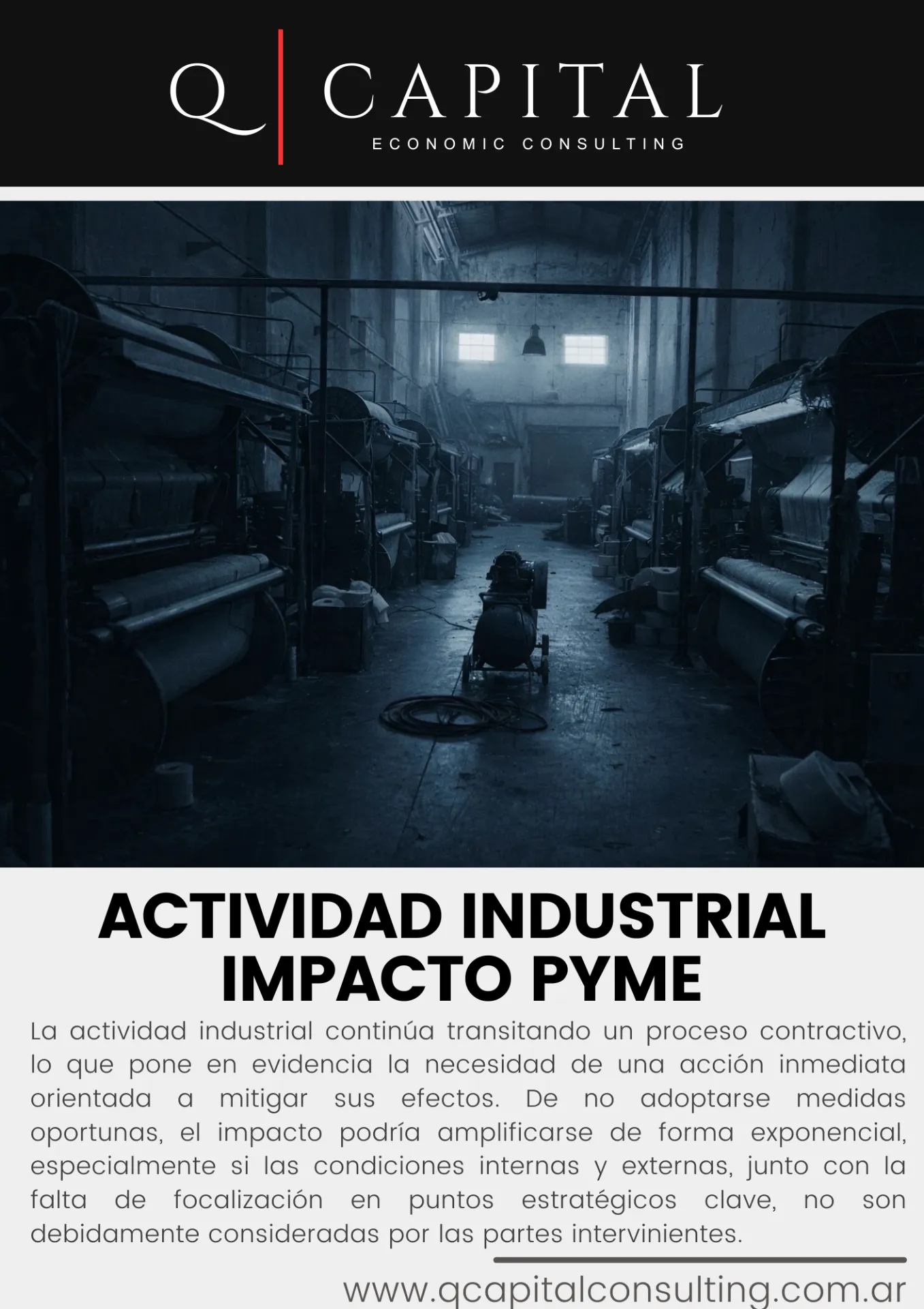 Actividad industrial y PyMES - Alerta por deterioro productivo Damian Quiros Director Ejecutivo de Q | Capital Economic Consulting, estuvo presente en Canal E de Editorial Perfil compartiendo la situación actual de las Pequeñas y Medianas Empresas. La incertidumbre puede dejar en el camino a más empresas que la propia situacion actual politica y economica, es momento de tomar acción ya que no es el rumbo el que esta en duda en este momento, sino el tiempo enfatizo Quiros. La actividad industrial atraviesa una fase contractiva que expone debilidades estructurales acumuladas durante décadas. La combinación de tasas de financiamiento elevadas, presión tributaria y apertura comercial intensificó las dificultades del entramado productivo, especialmente en las PyMES. Sectores como automotriz, textil, maquinaria y confecciones registran caídas de hasta dos dígitos, mientras el acceso al crédito y la volatilidad cambiaria continúan condicionando la inversión. Sin mejoras en competitividad, productividad y condiciones financieras, el escenario de mediano plazo podría derivar en reestructuraciones, cierres y mayor concentración industrial.